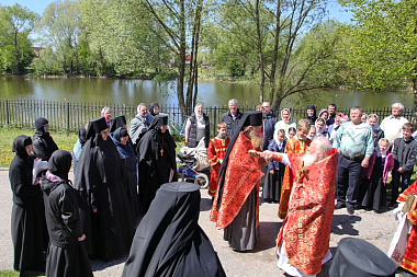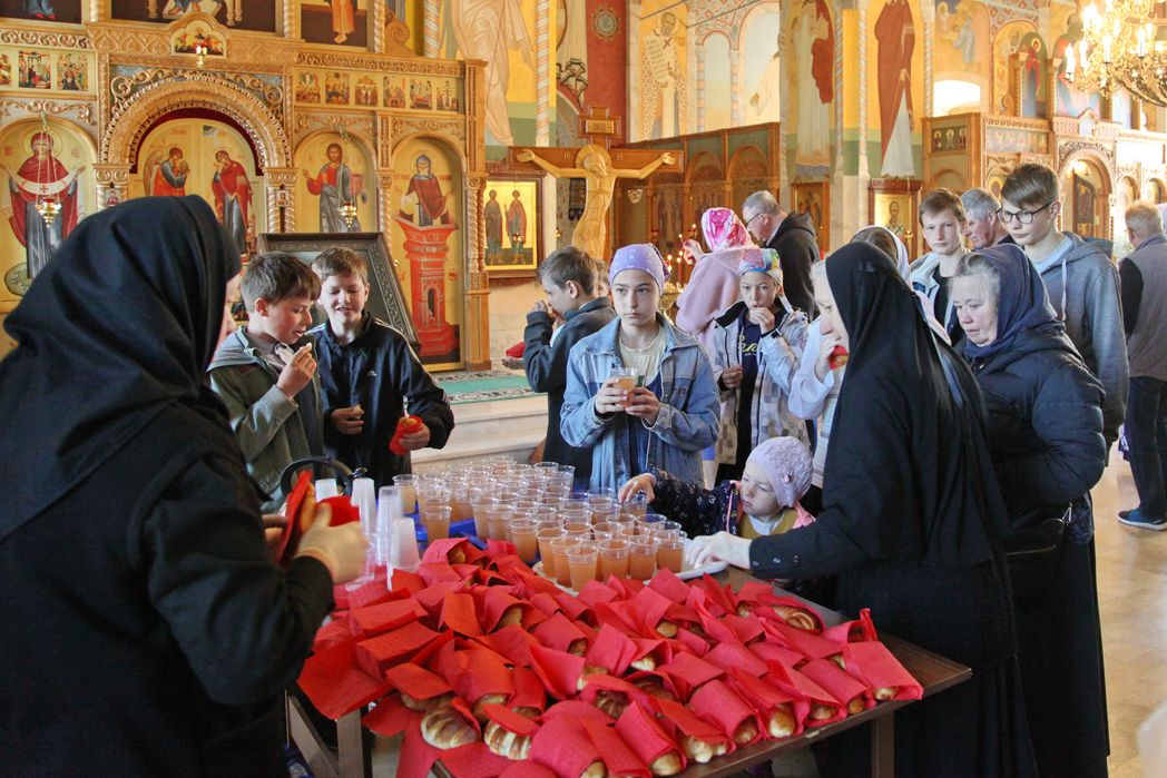 По окончании Божественной Литургии был совершен крестный ход с пением Пасхального канона. Всем гостям было предложено праздничное угощение.