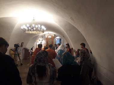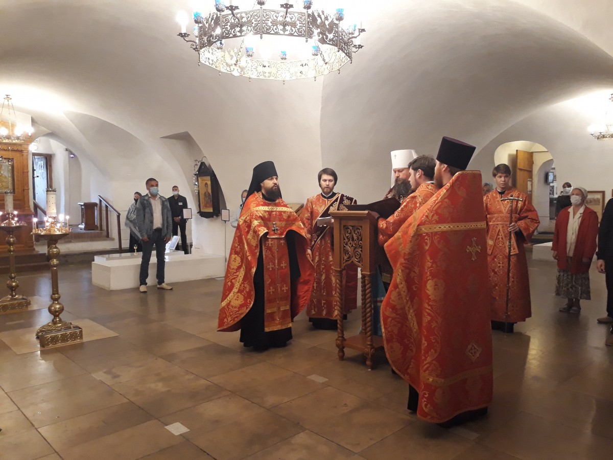 Молебен в усыпальнице бояр Романовых в храме прп. Романа Сладкопевца Новоспасской обители возглавил наместник монастыря митрополит Воскресенский Дионисий, управляющий делами Московской Патриархии.