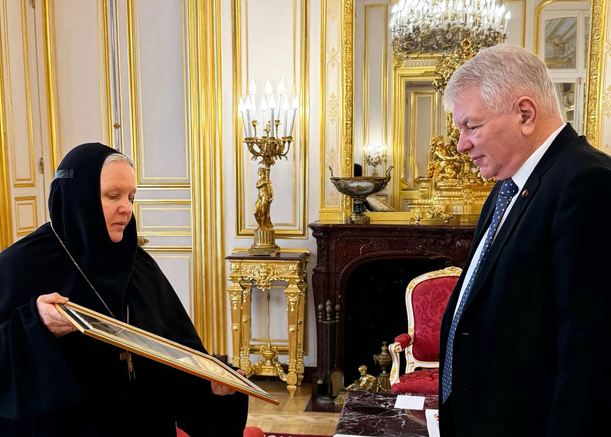 Игумения Маргарита (Феоктистова) передала Чрезвычайному и Полномочному Послу России во Франции А.Ю. Мешкову благодарность за его личные неоценимые заслуги по реализации выставки «Великий Русский Северный Путь» в Париже.