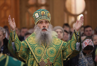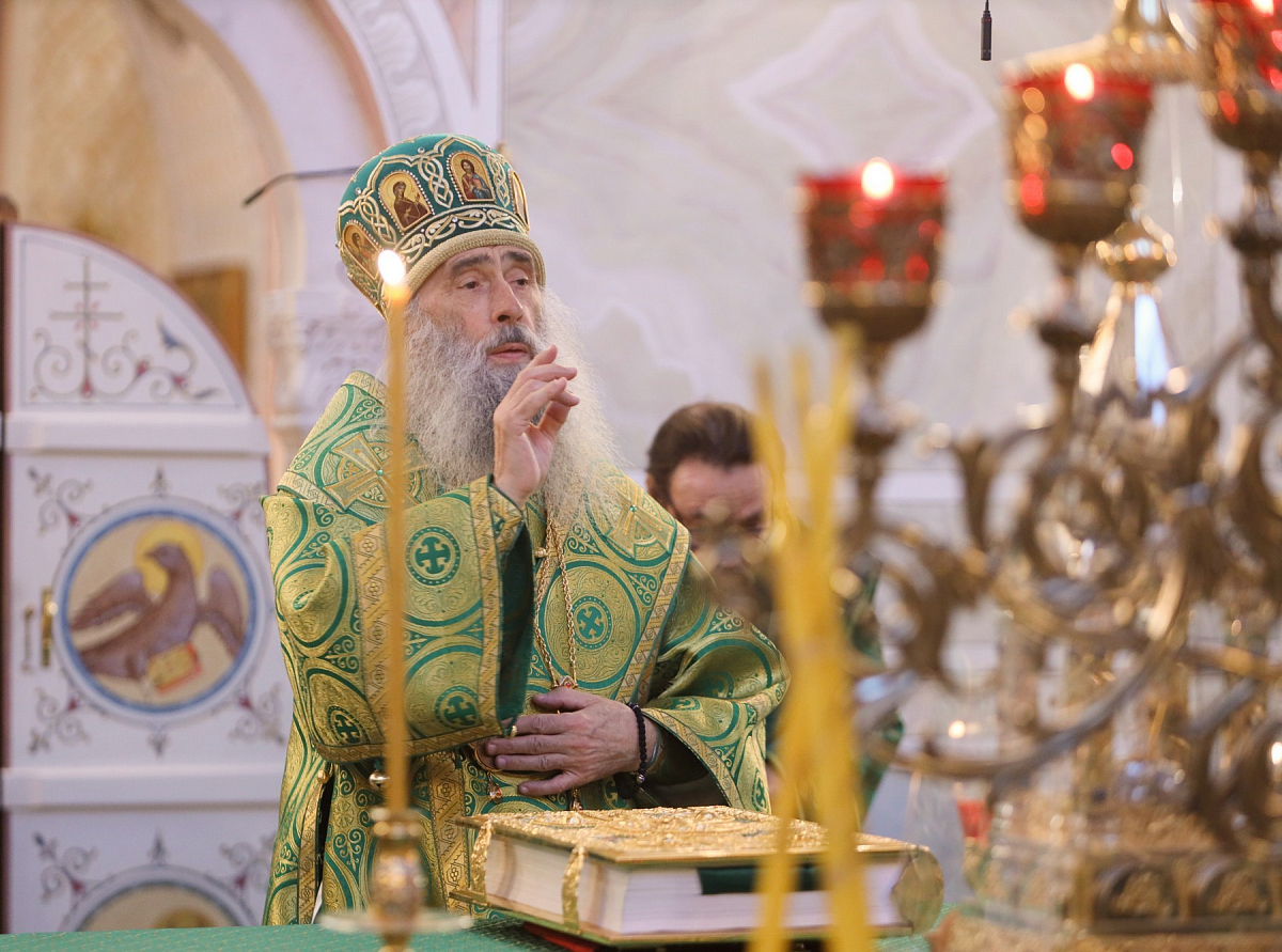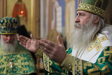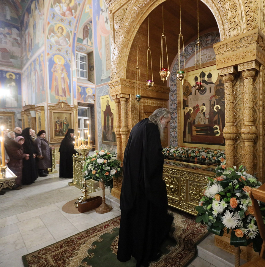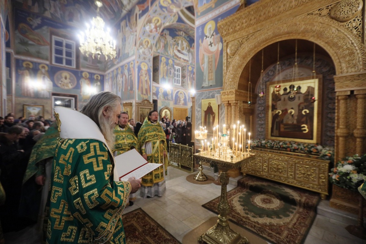 Раннюю Литургию в Покровском соборе обители перед ракой со святыми мощами Радонежских чудотворцев совершил председатель Синодального отдела по монастырям и монашеству архиепископ Каширский Феогност.