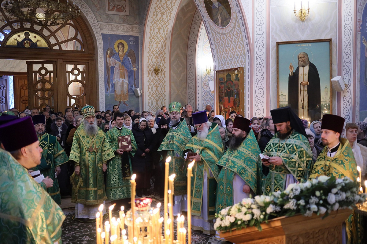 Затем архиерей с сослужившим духовенством совершили славление празднуемым святым, владыка Феогност прочитал им молитву и приложился к их честным мощам, после чего участники богослужения, включая игумению Олимпиаду с сестрами и воспитанницами монастырского приюта, также имели возможность приложиться к святыне.