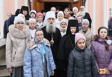 В завершение митрополит Сергий вручил сладкие подарки воспитанницам Православного детского пансиона при монастыре и детям украинских паломников, исполнивших для него колядки.