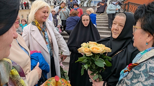 На площади у Центральных восточных врат монастыря глава Совета депутатов Сергиево-Посадского городского округа Р.Г. Тихомирова по сложившейся традиции организовала награждение матерей и жен воинов-участников СВО и волонтеров.