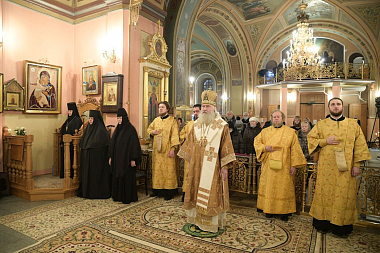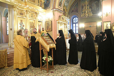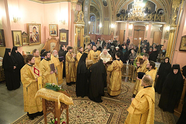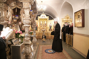 По прибытии в обитель митрополит Феогност поклонился честным мощам блаженной Матроны Московской, почивающим в Покровском храме монастыря.