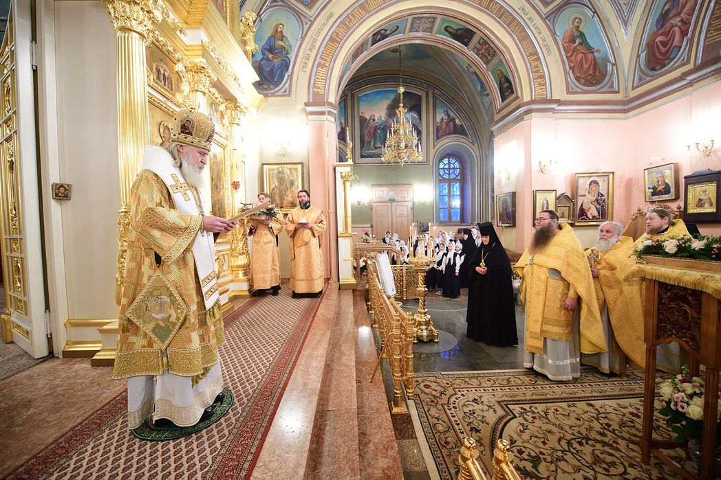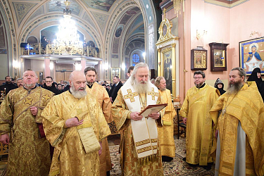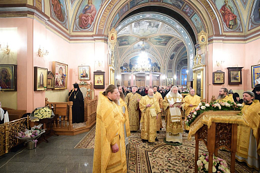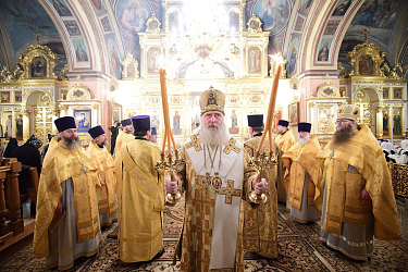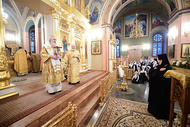 За Божественной литургией в соборе Воскресения Словущего Его Высокопреосвященству сослужили клирики обители.