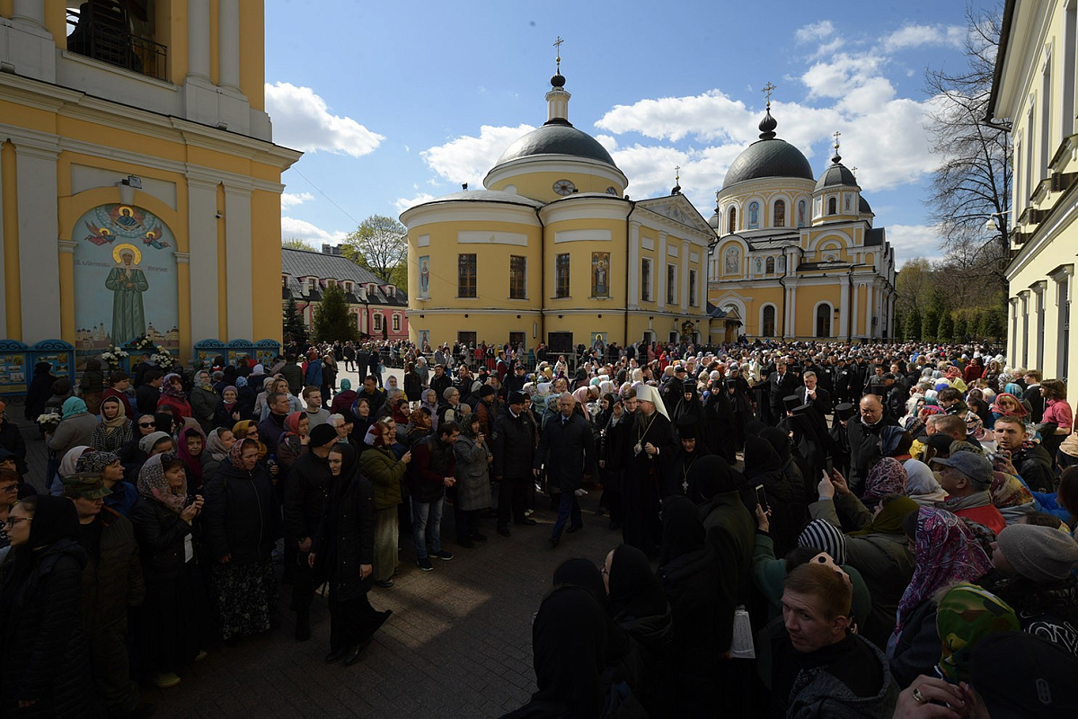По окончании Литургии состоялся крестный ход вокруг храмов обители. У мощей блаженной Матроны Московской митрополит Дионисий прочитал молитву святой старице. Хор торжественно пропел тропарь и величание блаженной Матроне.