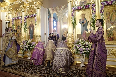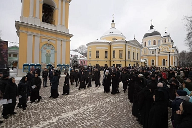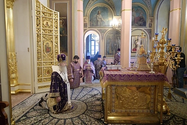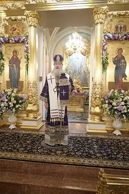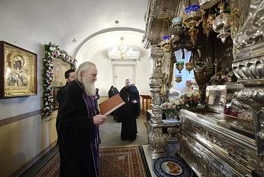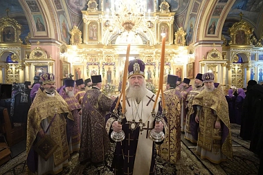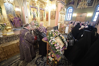 По прибытии в обитель архипастырь поклонился честным мощам блаженной Матроны Московской, почивающим в Покровском храме, а затем возглавил вечерню и Литургию Преждеосвященных Даров в Воскресенском соборе монастыря.