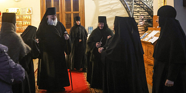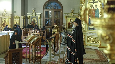 Его Преосвященству сослужили клирики обители.