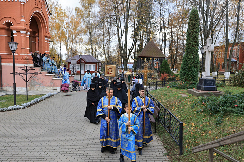 По окончании Литургии монастырское духовенство вместе с богомольцами прошли крестным ходом в храм Иерусалимской иконы Божией Матери, где совершили молебное пение пред Иерусалимской иконой Божией Матери.