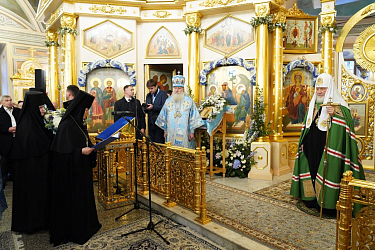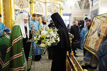 Игумения Феофания (Мискина) приветствовала Святейшего Патриарха Кирилла и преподнесла Его Святейшеству икону Покрова Божией Матери и букет белых роз.
