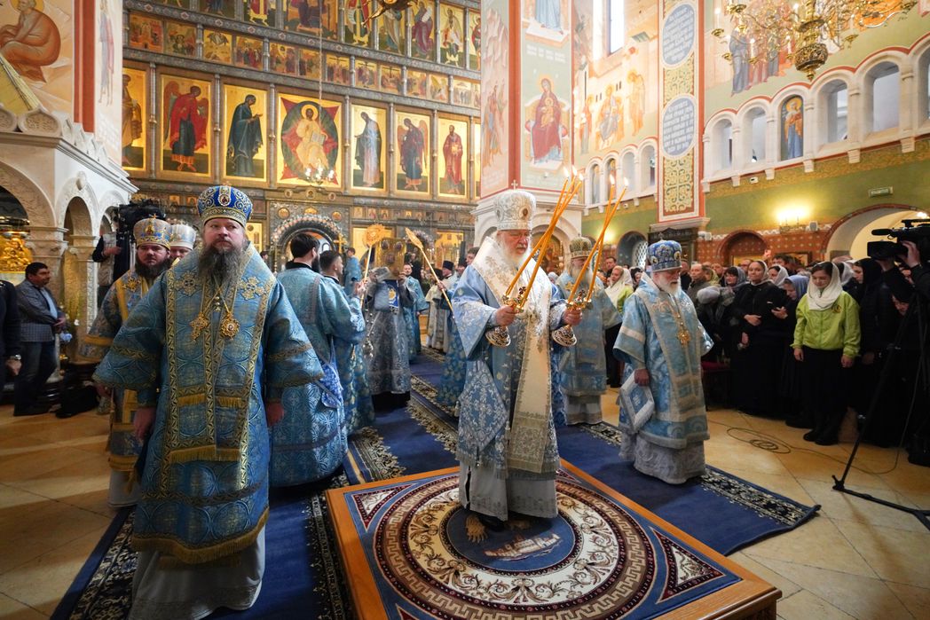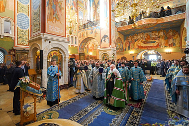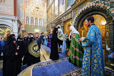 Перед началом богослужения у врат храма Предстоятеля Русской Православной Церкви встречала настоятельница обители, заместитель председателя Синодального отдела по монастырям и монашеству игумения Иулиания (Каледа). Святейший Владыка проследовал в собор Рождества Пресвятой Богородицы, где поклонился гробнице с иконными изображениями основательниц Зачатьевского монастыря игумении Иулиании и монахини Евпраксии, а также чудотворной иконе Божией Матери «Милостивая».