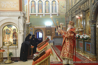 Его Преосвященству сослужили участники заседания рабочей группы по сбору материалов о новомучениках и исповедниках Церкви Русской и подвижниках благочестия, клирики обители.