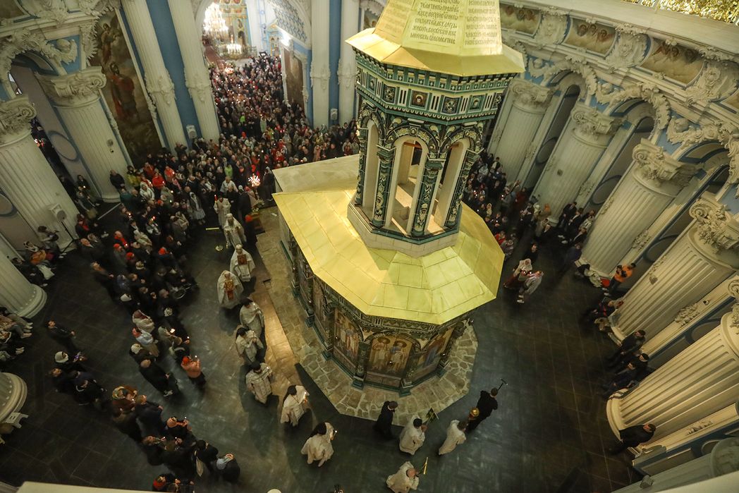 В полночь была проведена пасхальная полунощница, на 9-й песни канона было каждение вокруг Кувуклии, затем Плащаница была перенесена в алтарь Воскресенского собора.