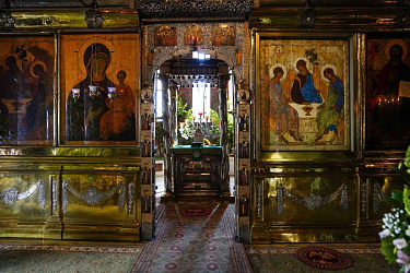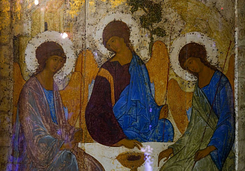 Наместник Лавры епископ Сергиево-Посадский и Дмитровский Кирилл приветствовал Предстоятеля Русской Православной Церкви и преподнес Его Святейшеству образ Троицы, написанный насельниками-иконописцами.