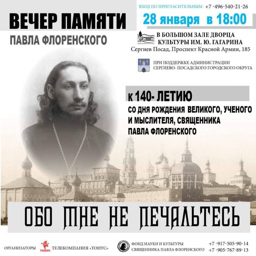 28 января в 18:00 во Дворце культуры имени Ю.А. Гагарина пройдет вечер памяти, посвященный 140-летию со дня рождения выдающегося мыслителя начала XX века священника Павла Флоренского.