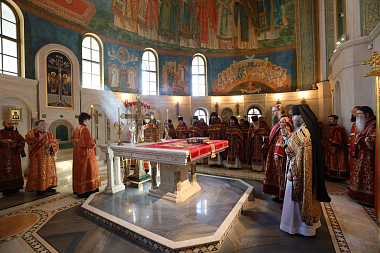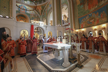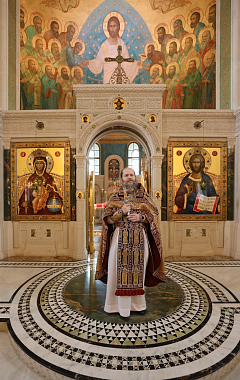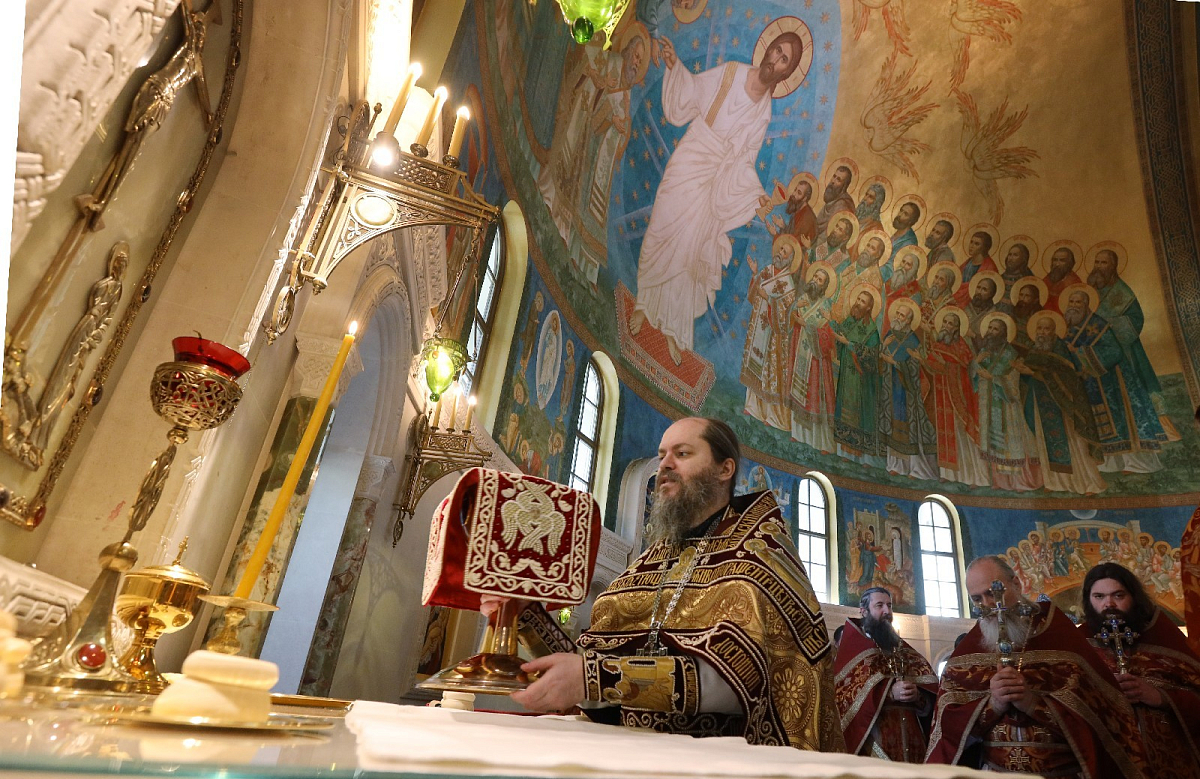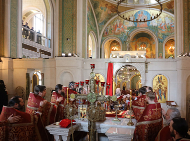 За Литургией в храме Воскресения Христова и Новомучеников и исповедников Церкви Русской наместнику Сретенского монастыря сослужили наместник Псково-Печерского монастыря иеромонах Иларион (Карандеев),гости и выпускники обители, братия в священном сане