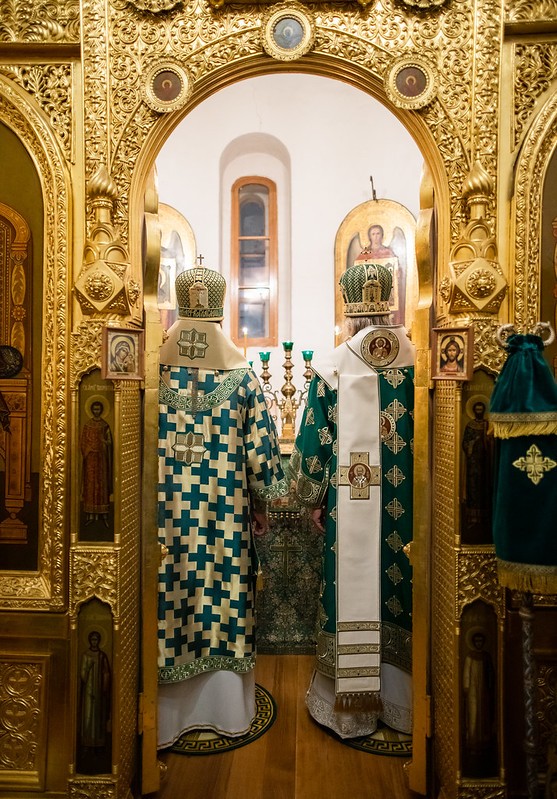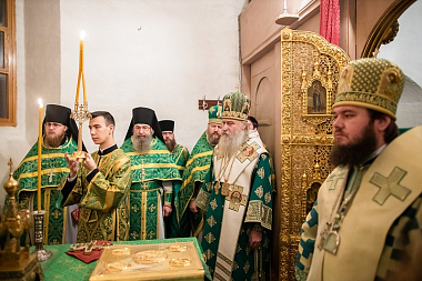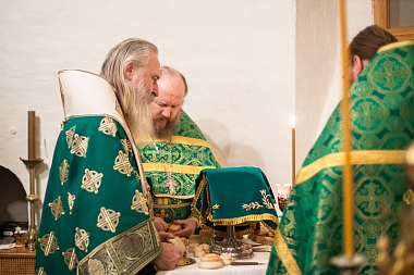 Литургию в Никоновском приделе Троицкого собора совершили архиепископ Каширский Феогност и епископ Сергиево-Посадский Фома.
