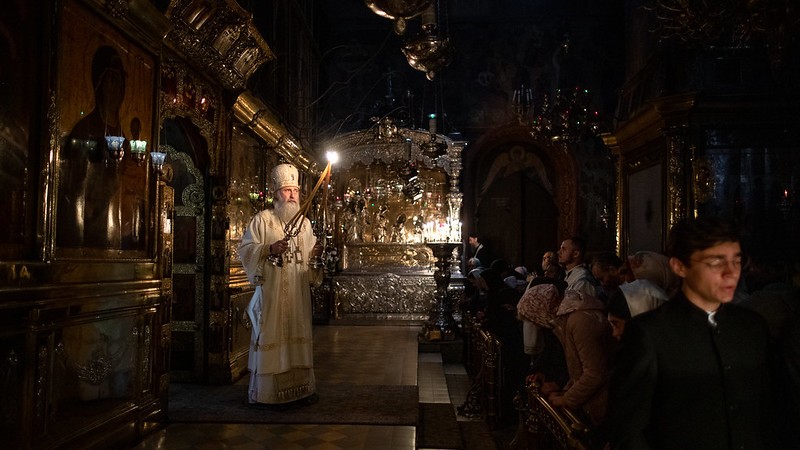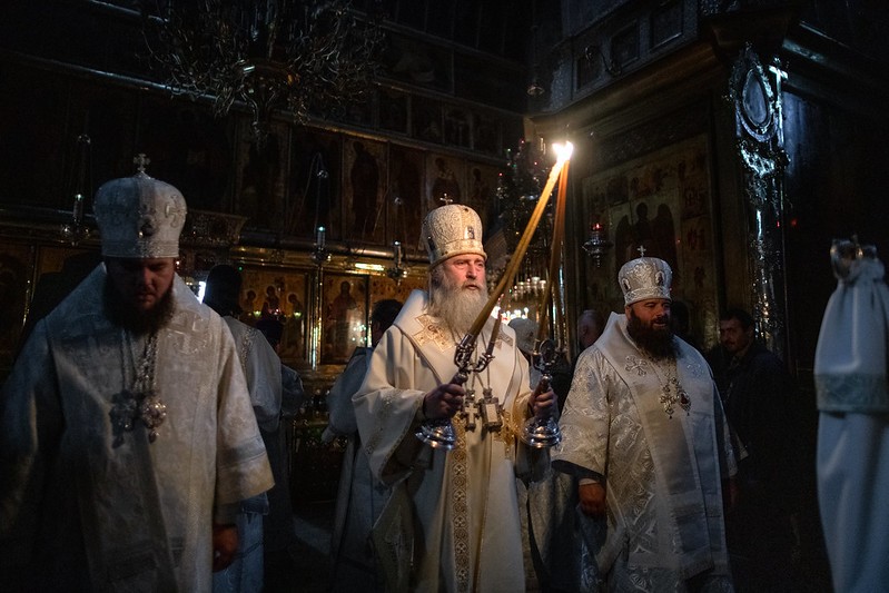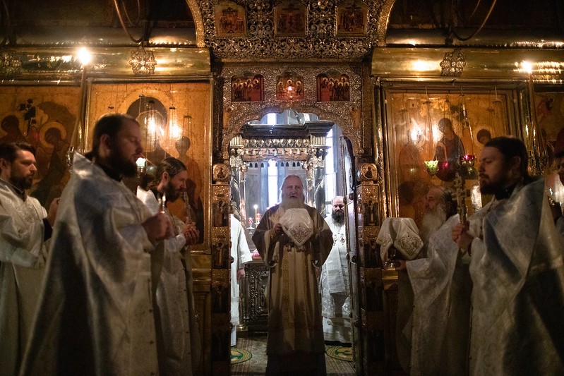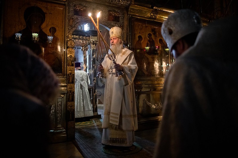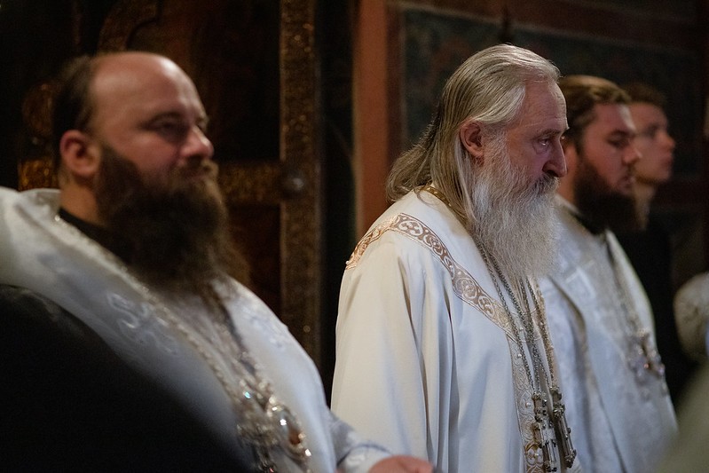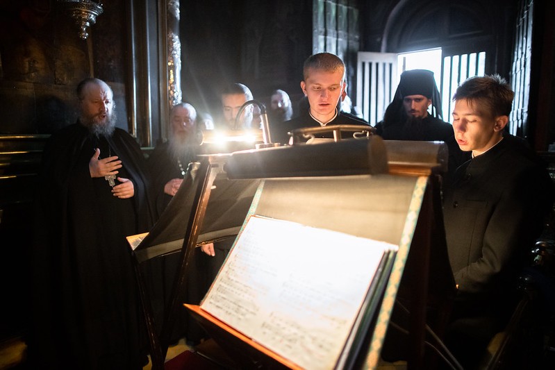 Церковные песнопения исполнил знаменный хор Лавры под управлением иеромонаха Зиновия (Бубякина).