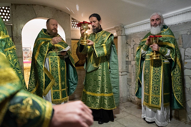 Позднюю Божественную литургию в Успенском соборе совершил епископ Орский Ириней.