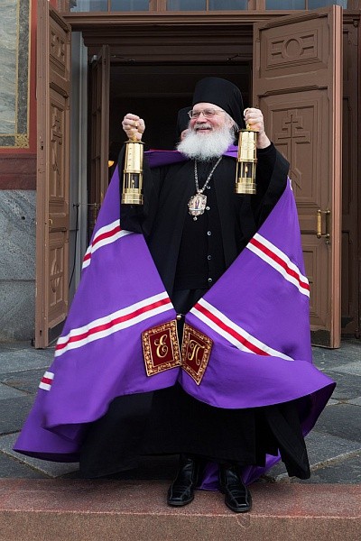 «Я помню, в 1992 году мы в первый раз после Первой мировой войны везли Благодатный огонь со Святой Земли со многими искушениями, – продолжил Его Преосвященство. – Мы тогда имели самодельные лампады – в то время еще не было таких прекрасных лампад неугасимых, которые можно носить при самом сильном ветре и с огнем ничего не произойдет.