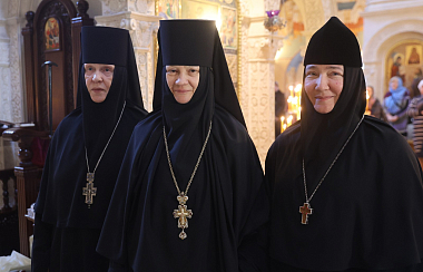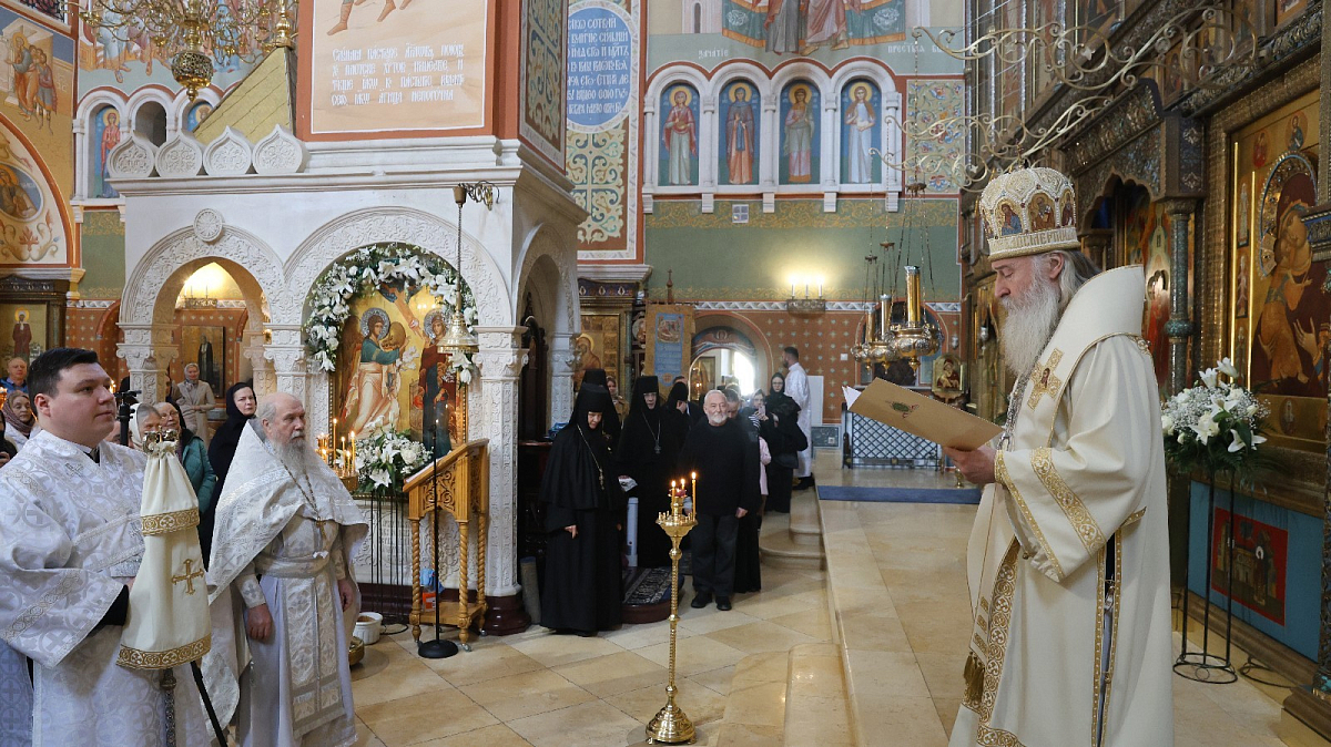 Затем Высокопреосвященнейший владыка огласил поздравительный адрес Святейшего Патриарха Московского и всея Руси Кирилла, направленный игумении Иулиании (Каледе) по случаю 25-летия монашеского пострига.