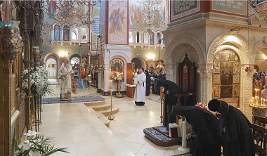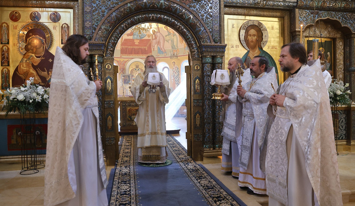 За Божественной литургией Его Высокопреосвященству сослужили настоятель храма Троицы Живоначальной на Грязях, у Покровских ворот протоиерей Иоанн Каледа и монастырское духовенство.