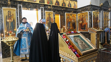 В Благовещенском храме подворья в этот день на праздничном аналое была старинная малахитовая икона Божией Матери «Казанская», которую летом 2023 года чудесным образом обрели в реке Ставок на подворье монастыря. Служили клирики монастыря иерей Владимир Зыков и иеродиакон Николай (Тищенко), песнопения исполнил византийским распевом монастырский хор под управлением регента Марины Ефимовой.