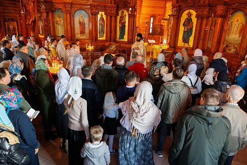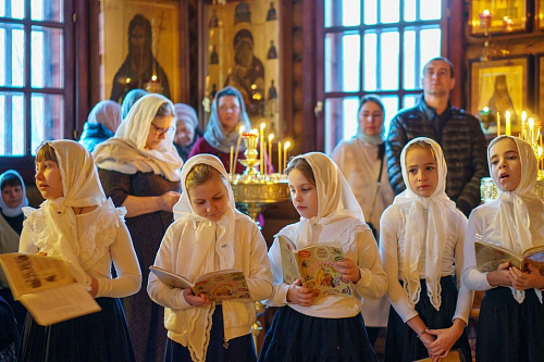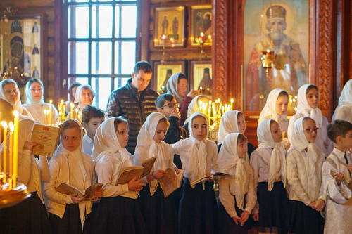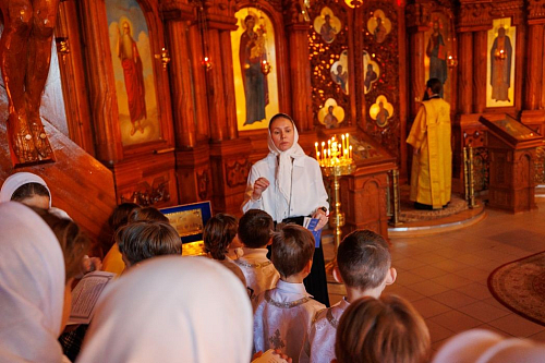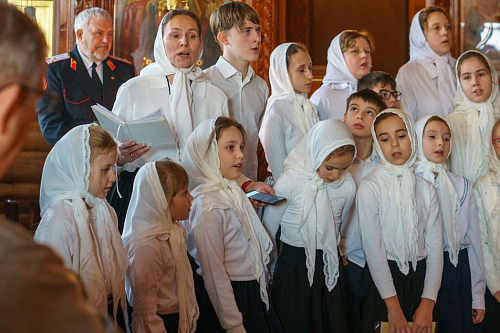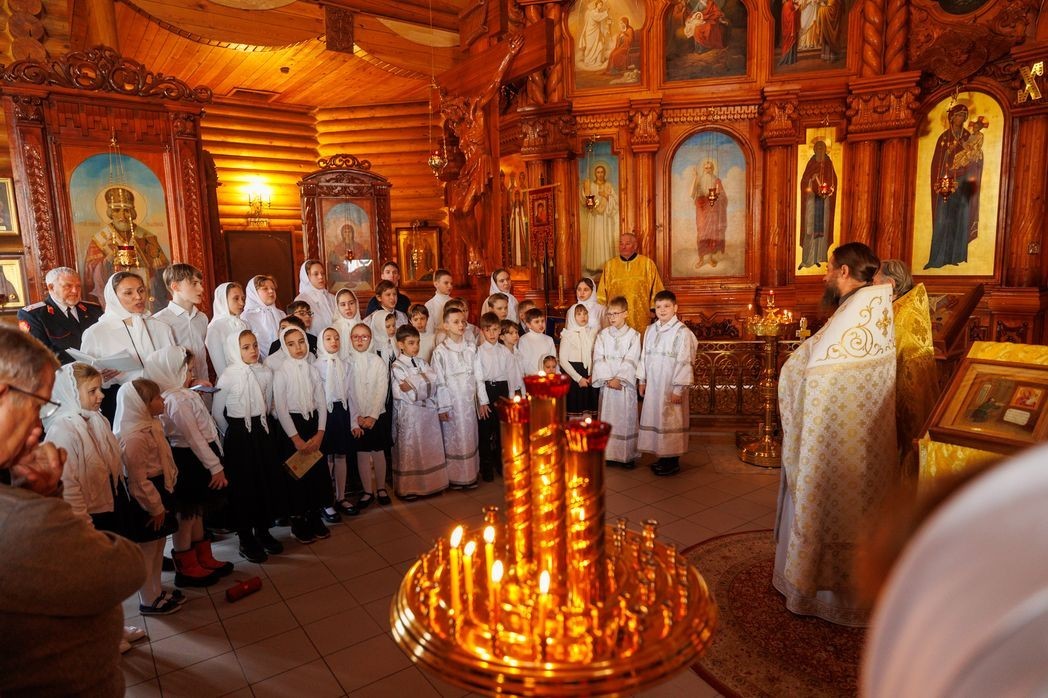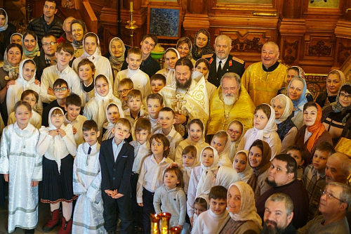 За богослужением молились дети разных возрастов. Ребята пели и помогали в алтаре в ходе всего богослужения. Молодые пономари трудились в алтаре под началом летчика-космонавта Валерия Григорьевича Корзуна. Детским хором руководила преподаватель воскресной школы Яна Станиславовна Немцева.