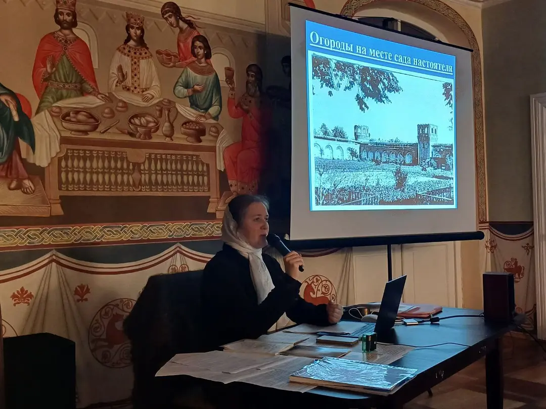 Выступление сопровождалось показом слайд-презентации, где были представлены уникальные фотографии Донского монастыря начала XX века, а также фотографии настоятелей и братии 1920-1930-х годов, которые хранятся в архивах УФСБ Российской Федерации.
