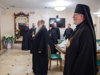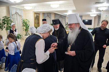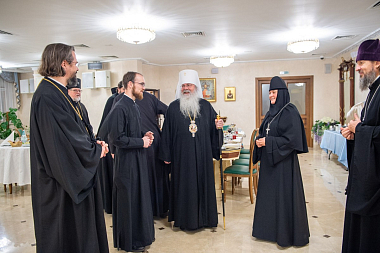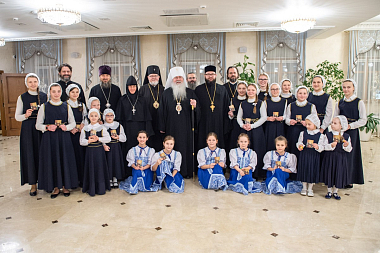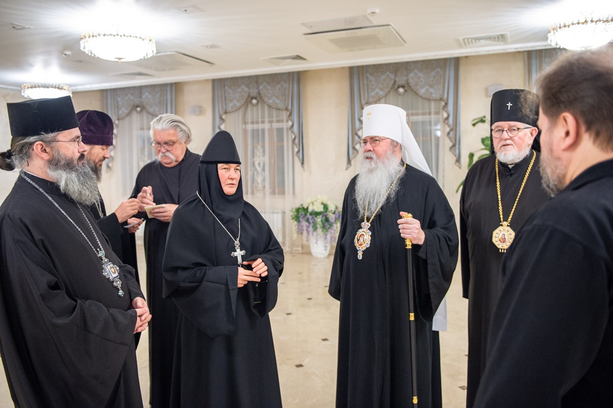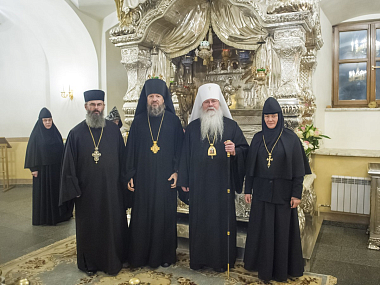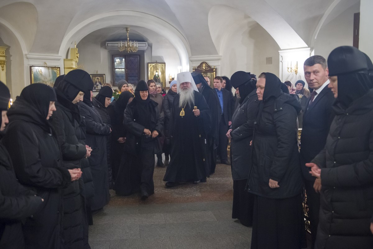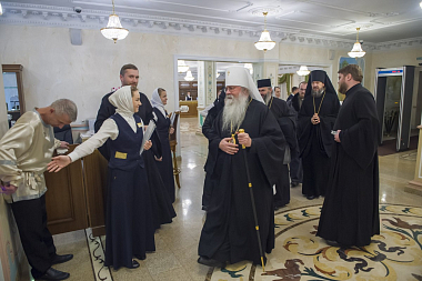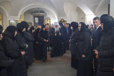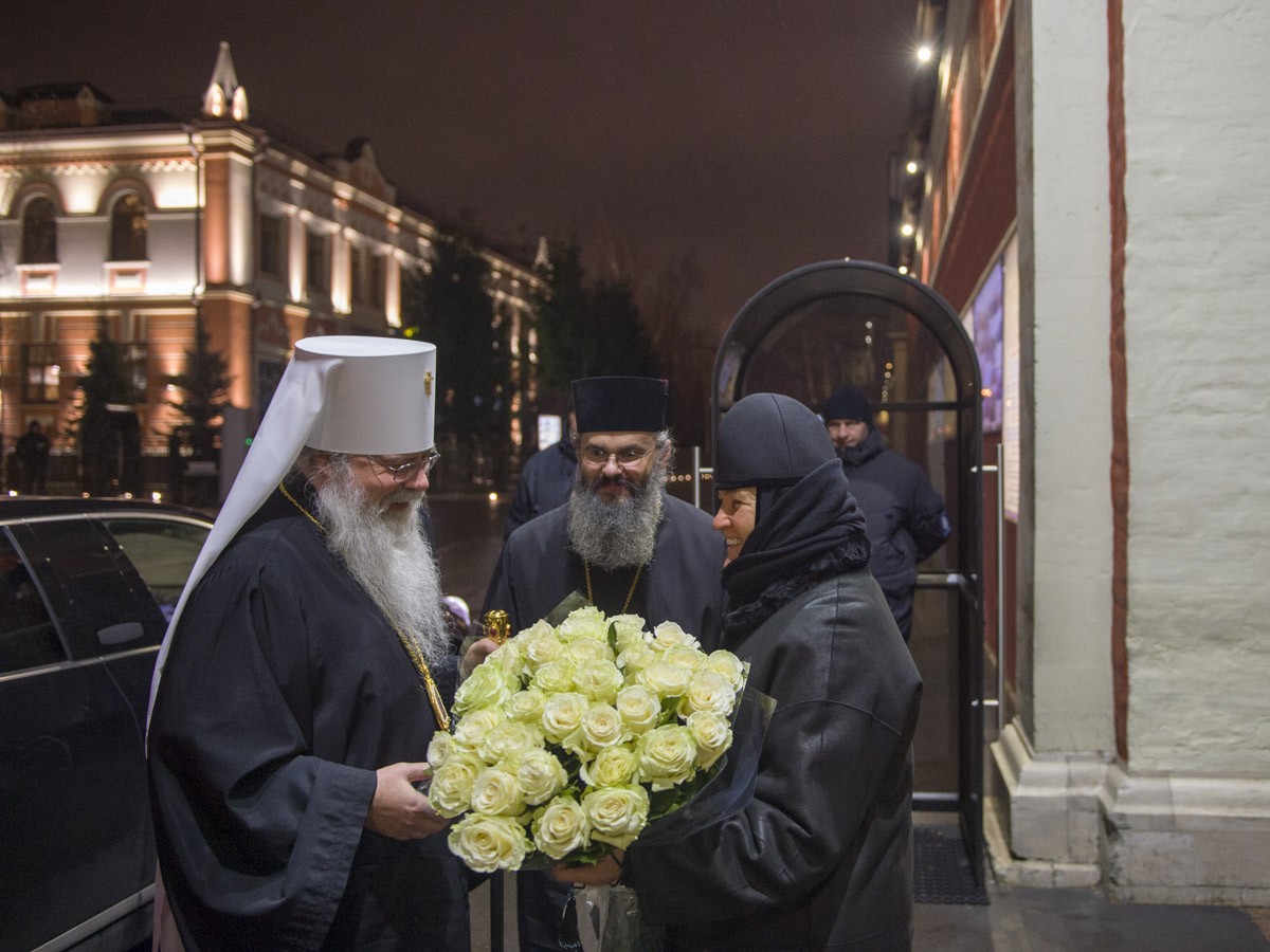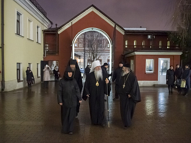 5 декабря Блаженнейшего митрополита Тихона и сопровождавших его членов делегации встречала настоятельница Покровского ставропигиального женского монастыря игумения Феофания (Мискина) с сестрами.
