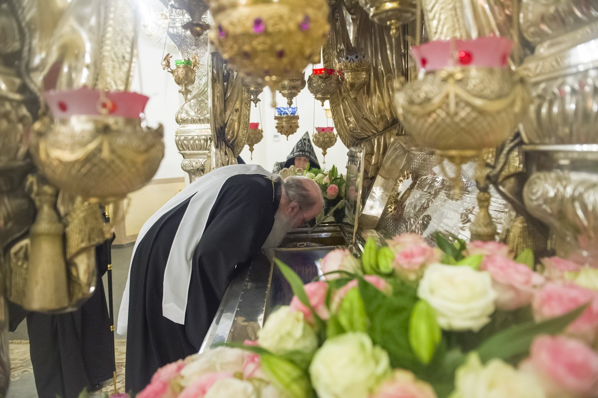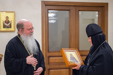 В завершение на молитвенную память Предстоятель Православной Церкви в Америке подарил игумении Феофании икону преподобного Германа Аляскинского с частицей мощей.