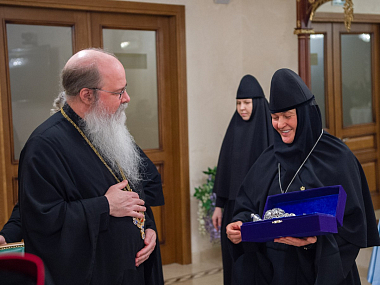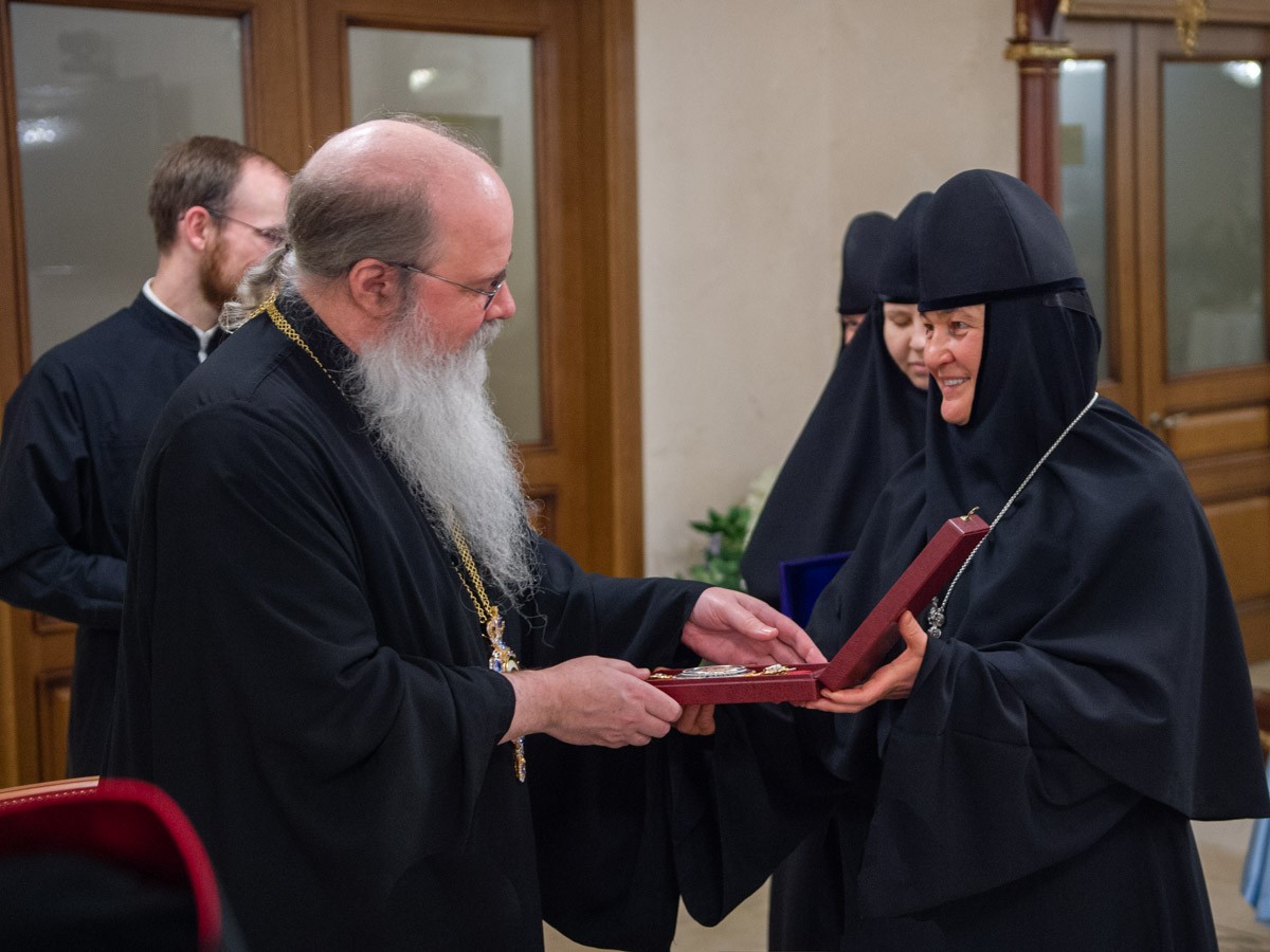 В память о посещении обители игумения Феофания преподнесла в дар Блаженнейшему владыке святую панагию и кадило, а всем членам делегации – памятные подарки.