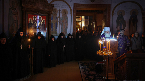Вечером 4 марта 2025 года, во вторник первой седмицы Великого поста, председатель Синодального отдела по монастырям и монашеству, наместник Донского ставропигиального мужского монастыря митрополит Каширский Феогност совершил великое повечерие с чтением Великого покаянного канона преподобного Андрея Критского в Троицком соборе Борисоглебского Аносина ставропигиального женского монастыря.