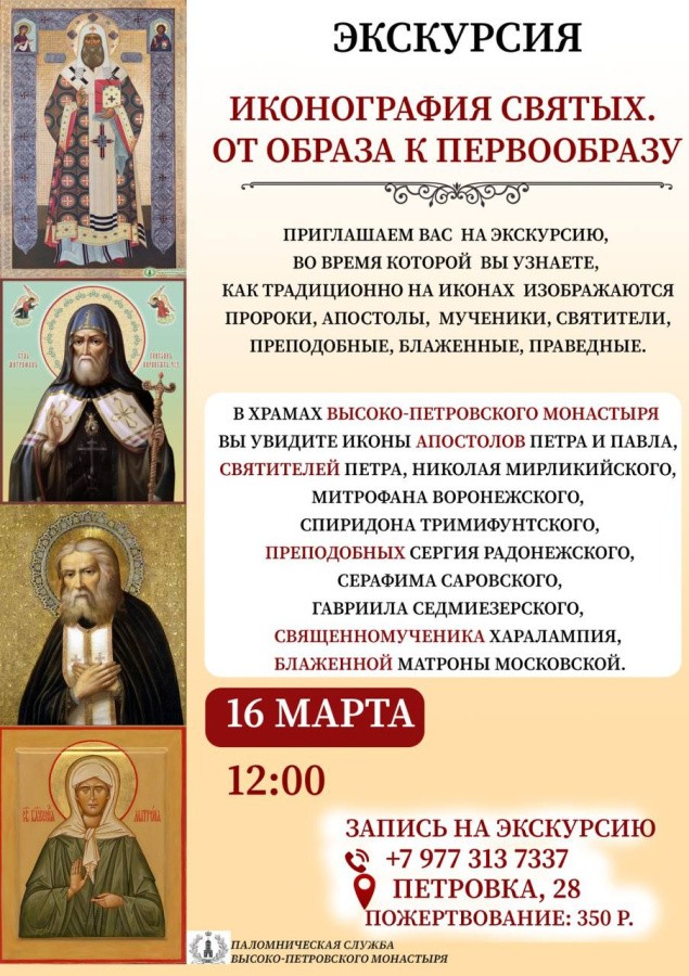 Паломническая служба Высоко-Петровского ставропигиального мужского монастыря города Москвы приглашает на экскурсию, посвященную иконографии святых.