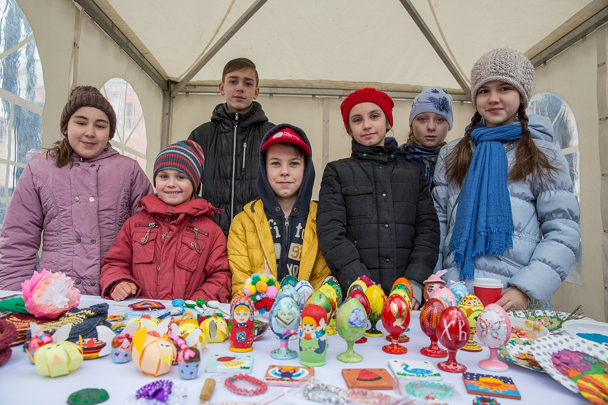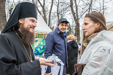 Под одним из шатров на Страстном бульваре разместилась ярмарка работ учеников Воскресной школы при Высоко-Петровском монастыре. Расписные яйца, украшения, рисунки, вязаные изделия, поделки и сувениры – ребята давно готовились к Пасхальному фестивалю и смастерили всё это своими руками.