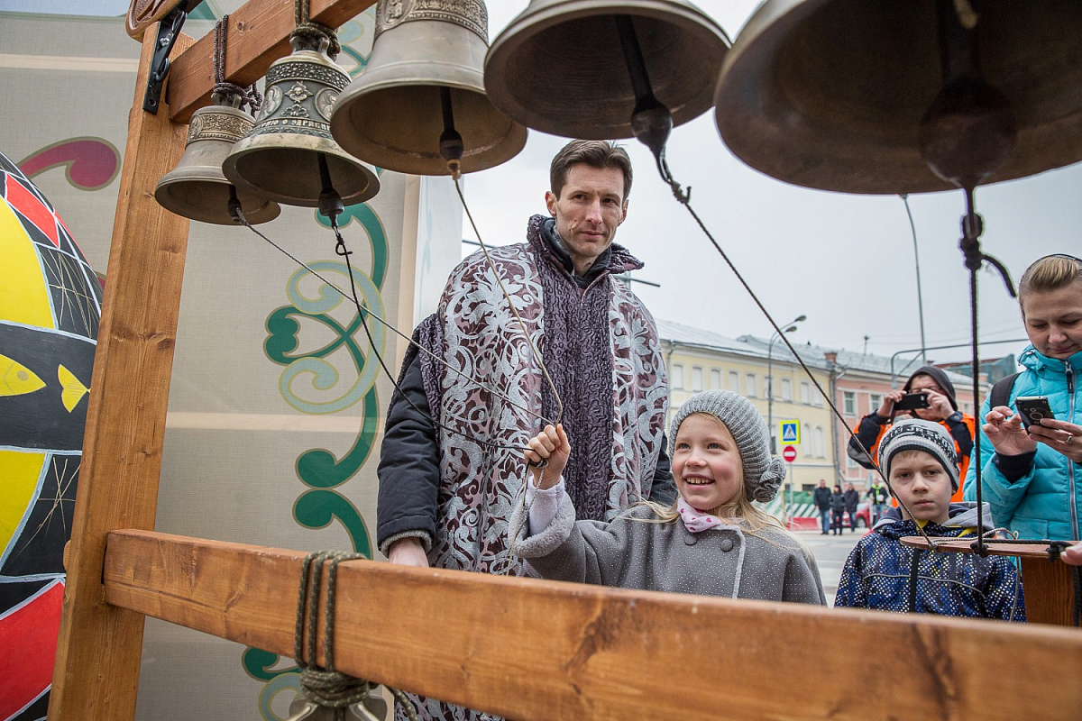 В перерывах между выступлениями народных коллективов и взрослые, и дети трезвонили в колокола, специально установленной рядом со сценой звонницы.