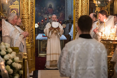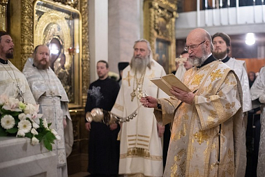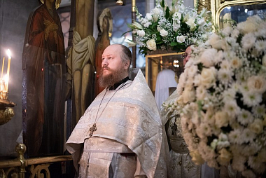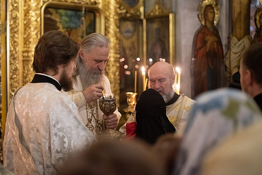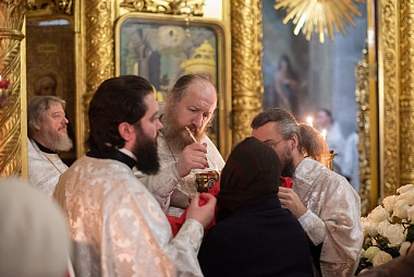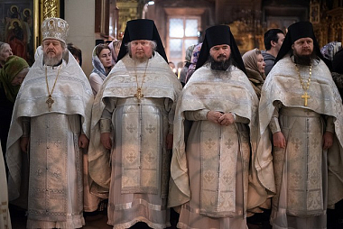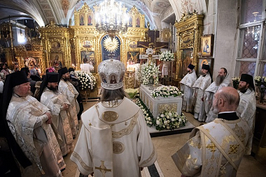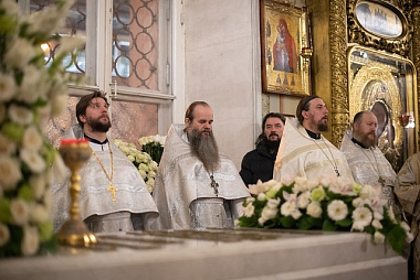 Его Высокопреосвященству за Литургией сослужили: благочинный Свято-Троицкой Сергиевой лавры архимандрит Павел (Кривоногов), настоятель подворья Троице-Сергиевой лавры в Москве архимандрит Дионисий (Колесник), член Коллегии Синодального отдела по монастырям и монашеству игумен Филипп (Ельшин), эконом обители игумен Евтихий (Гурин), братия Свято-Троицкой Сергиевой лавры в священном сане и клирики приходов Москвы.