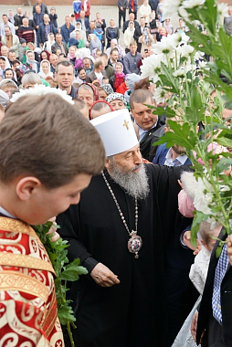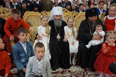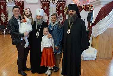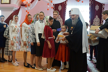 Блаженнейший Владыка поздравил детей и их воспитателей со Светлым Христовым Воскресением, вручил каждому пасхальные подарки и благословил всех.