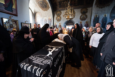 За богослужением молились настоятельница Покровского монастыря г. Киева игумения Каллисфения (Шамайло), настоятельница Киевского Пантелеимонова монастыря в Феофании игумения Елисавета (Андреева), настоятельница Архангело-Михайловского женского монастыря г. Одессы игумения Серафима (Шевчик), насельницы Флоровского монастыря, родные и близкие почившей, киевское духовенство, многочисленные прихожане Флоровской обители.