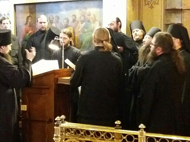 На малом входе Предстоятель Украинской Православной Церкви удостоил братию монастыря в священном сане богослужебных наград.