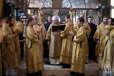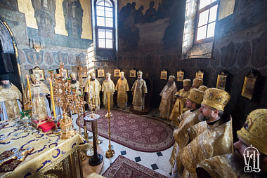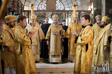 За Литургией Его Блаженству сослужили наместник обители митрополит Вышгородский и Чернобыльский Павел, управляющий делами Украинской Православной Церкви митрополит Бориспольский и Броварской Антоний, архиепископ Гурий (Кузьменко), архиепископ Бучанский Пантелеимон, епископ Барышевский Виктор, епископ Белогородский Сильвестр и духовенство Лавры.