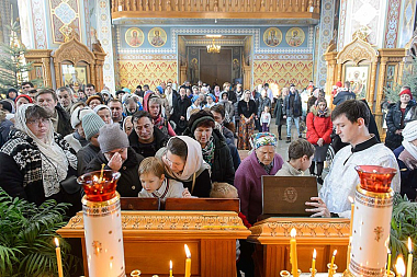 Перед иконой праздника и ковчегом духовенство, хор и верующие исполнили тропарь, кондак и величание празднику Рождества Господа Бога и Спаса нашего Иисуса Христа.