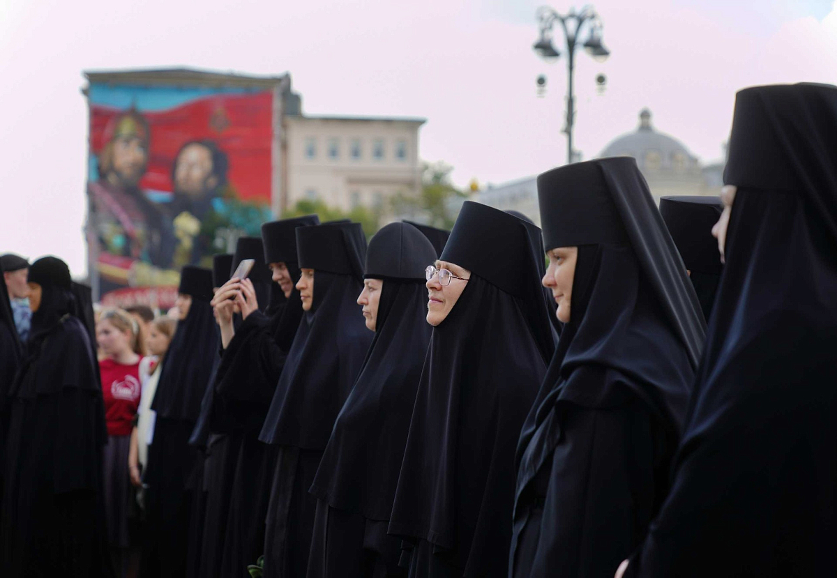 В торжественном шествии следовали прибывшие в Москву дети из пострадавших семей Донецкой Народной Республики, а также из освобожденных районов Харьковской области и Луганской Народной Республики.