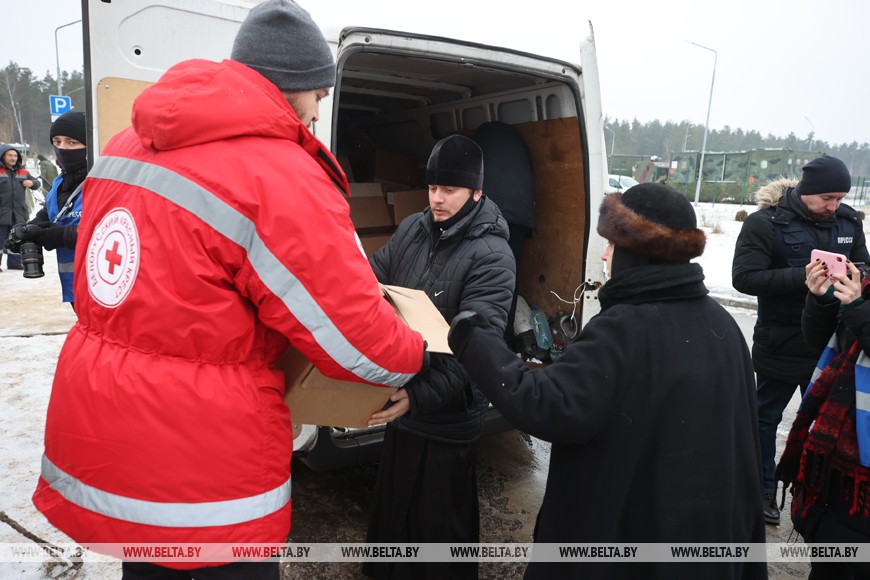 Игумения Гавриила не в первый раз посещает беженцев на границе. Сегодня она и клирик Свято-Троицкого собора города Слонима иерей Иоанн Нудьга доставили в транспортно-логистический центр, где находится пункт временного размещения, груз от Жировичского ставропигиального мужского монастыря, Гродненского монастыря и Новогрудской епархии.