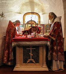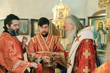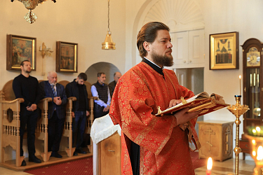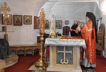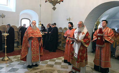 За Литургией Его Высокопреосвященству сослужили и.о. настоятеля московского подворья Русского Пантелеимонова монастыря на Афоне иеромонах Никита (Смернягин) с братией подворья.