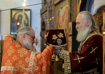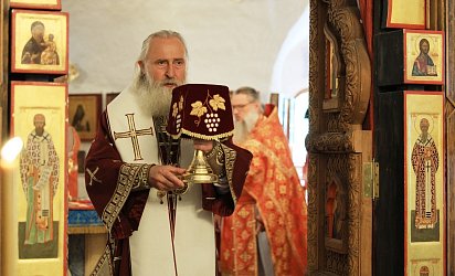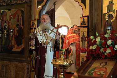 Перед началом богослужения митрополит Феогност поклонился честным мощам преподобного Аристоклия, старца Афонского и Московского.
