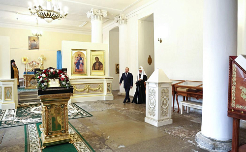В.В. Путин и Святейший Патриарх Кирилл посетили Благовещенский храм лавры.