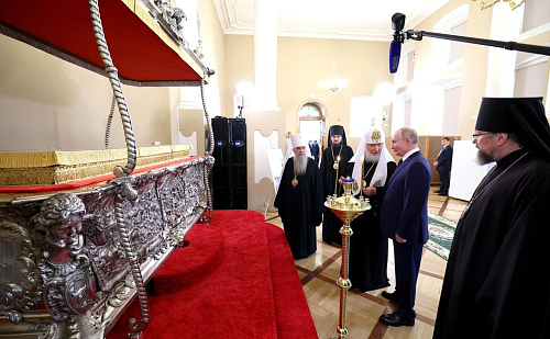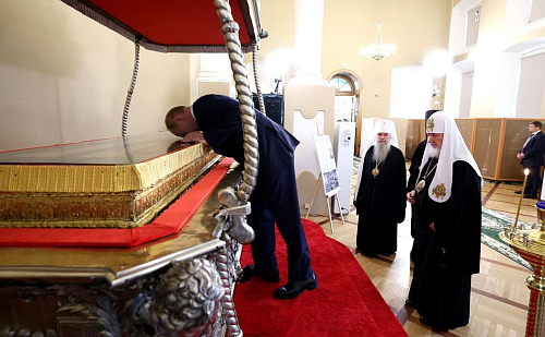 В верхнем храме, где в настоящее время пребывает историческая рака с мощами святого благоверного князя Александра Невского, глава государства и Святейший Владыка поклонились святым мощам.