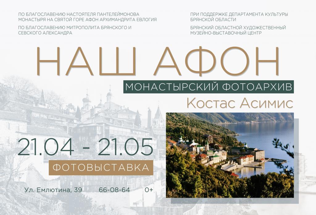 21 апреля 2023 года в 14.00 в рамках XV областного Пасхального фестиваля искусств и народного творчества «Светлая седмица» по благословению митрополита Брянского и Севского Александра и настоятеля Пантелеимонова монастыря на Святой Горе Афон архимандрита Евлогия (Иванова) в Брянском областном художественном музейно-выставочном центре состоится открытие выставочного проекта «Наш Афон. Монастырский фотоархив» фотохудожника Костаса Асимиса.