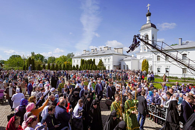 У врат Полоцкого Спасо-Евфросиниевского женского монастыря Святейшего Патриарха встречали настоятельница монастыря игумения Евдокия (Левшук) с сестрами обители, настоятельницы женских монастырей Белорусской Православной Церкви.